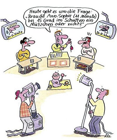 Prima: Das Informationszeitalter bietet ihnen in Hülle und Fülle Zugang zu wissenschaftlichen Erkenntnissen und Erfahrungen anderer Eltern. Wo früher ärztliches Fachpersonal, Hebammen und Großmütter als Ratgeber die „erste Geige“ spielten, haben manche junge Eltern sich heute selbst zu Fachleuten in vielen Belangen rund ums Kind durchgelesen. Die Kehrseite der Medaille: Manchmal fühlen sie sich von gegensätzlichen Experten-Meinungen verunsichert. Und vor allem setzt die Fülle an Informationen Mütter und Väter gehörig unter Druck, weil sie ihnen vorgaukelt: Die perfekte Erziehung ist möglich! Wer jetzt noch Fehler macht, ist selber schuld!